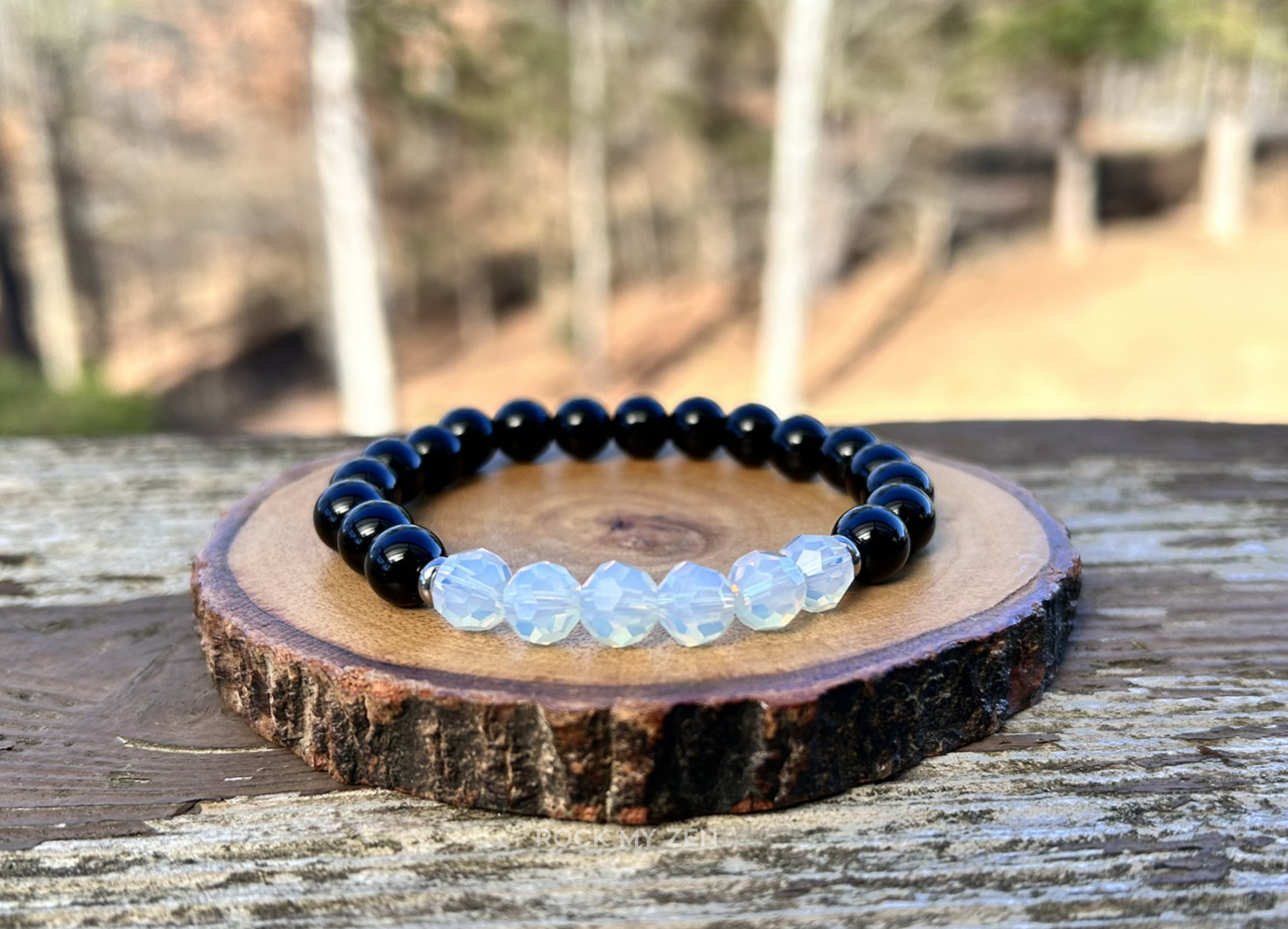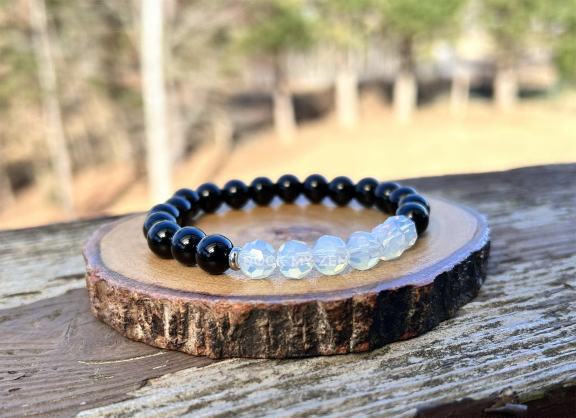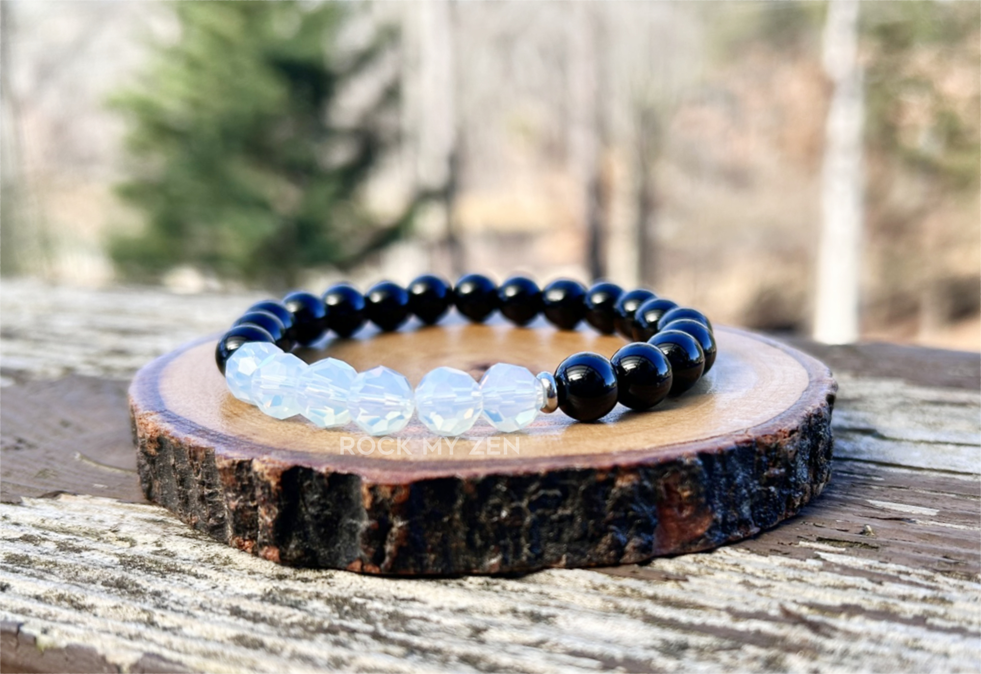 This Rock My Zen combination was created with faceted opalite glass and black onyx beads. The faceted Opalite beads adds an extra sparkle to the bracelet. The 8mm size is the common standard bead size. If you do not want the spacers, please let me know in the "notes to seller" section when checking out.