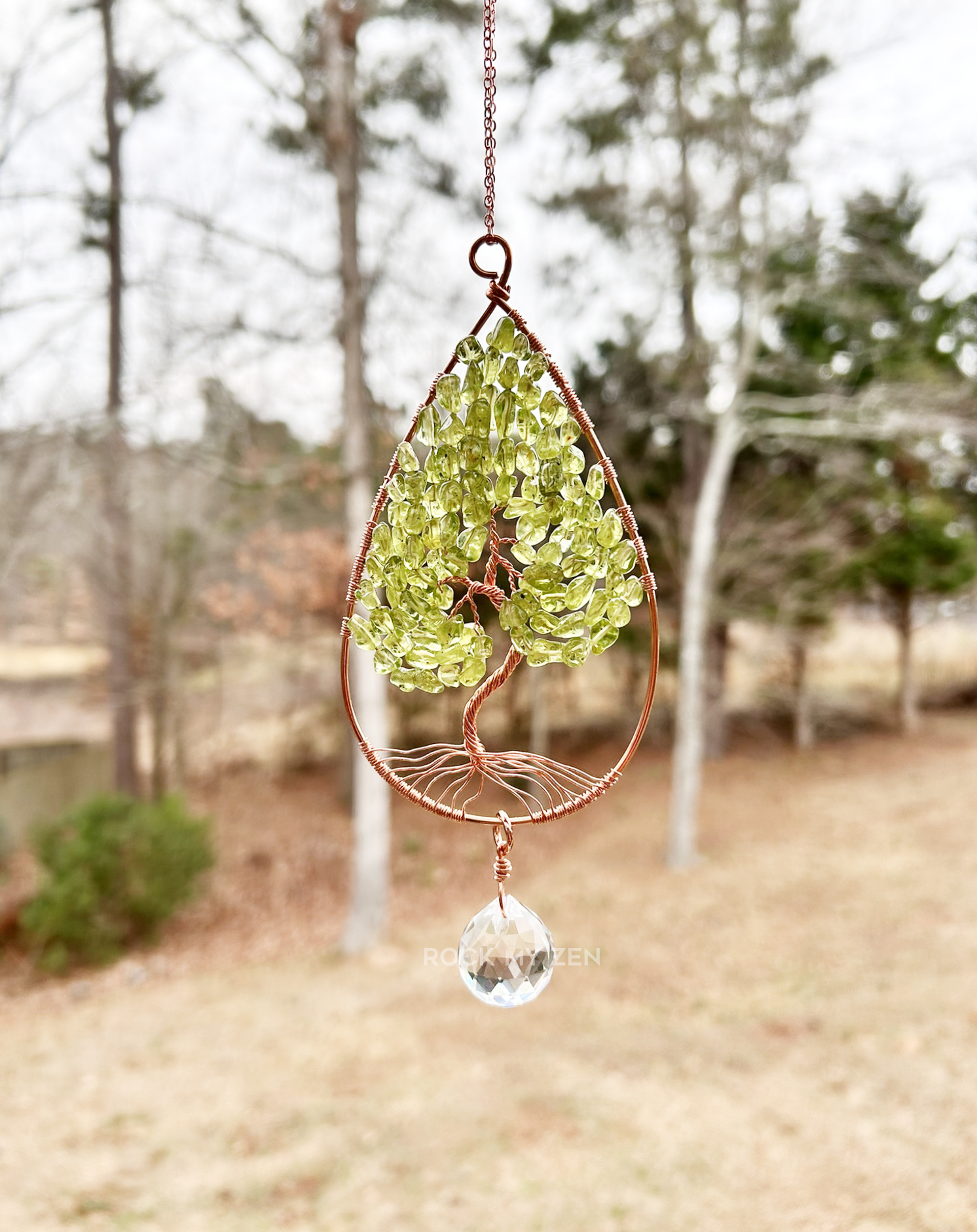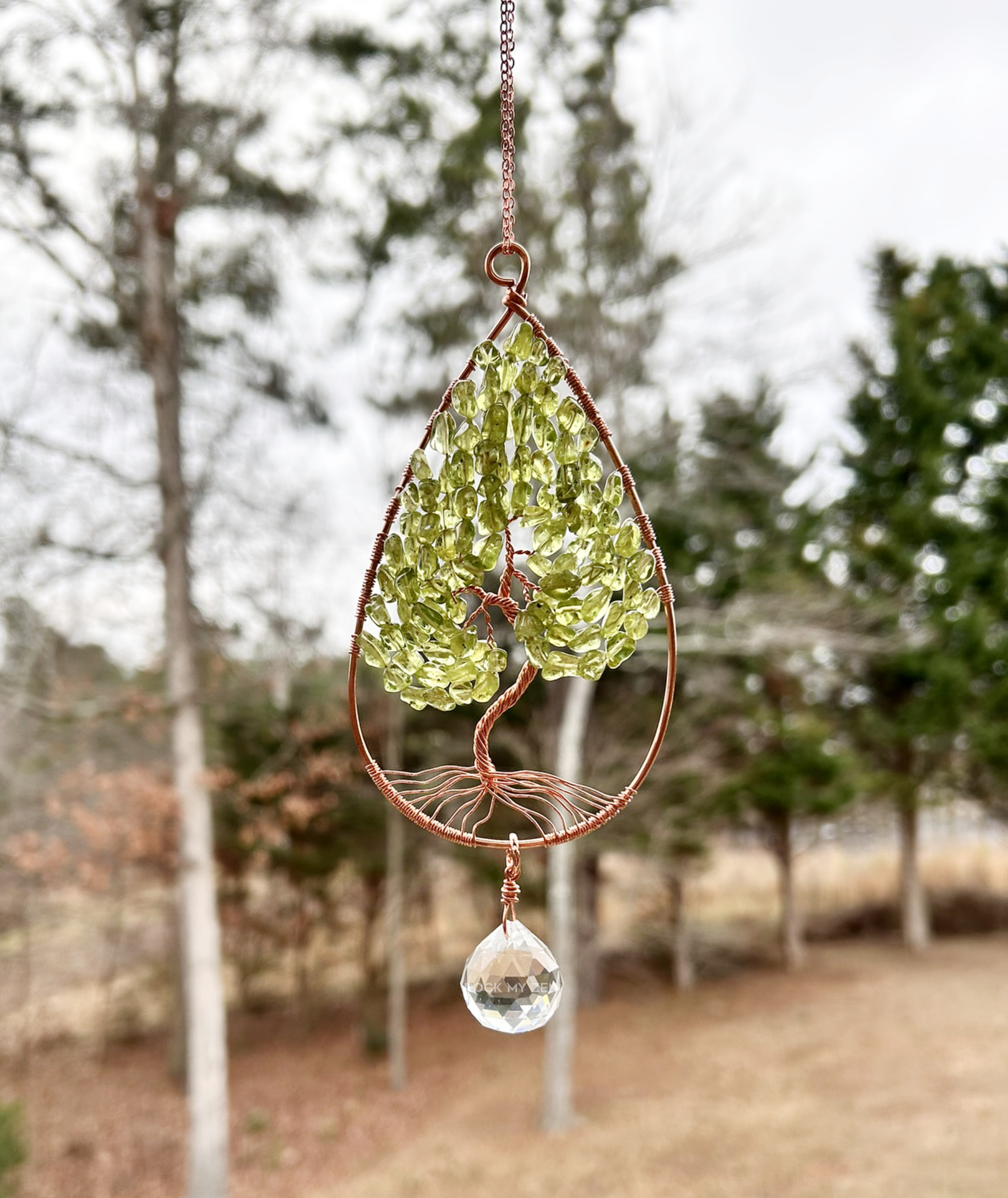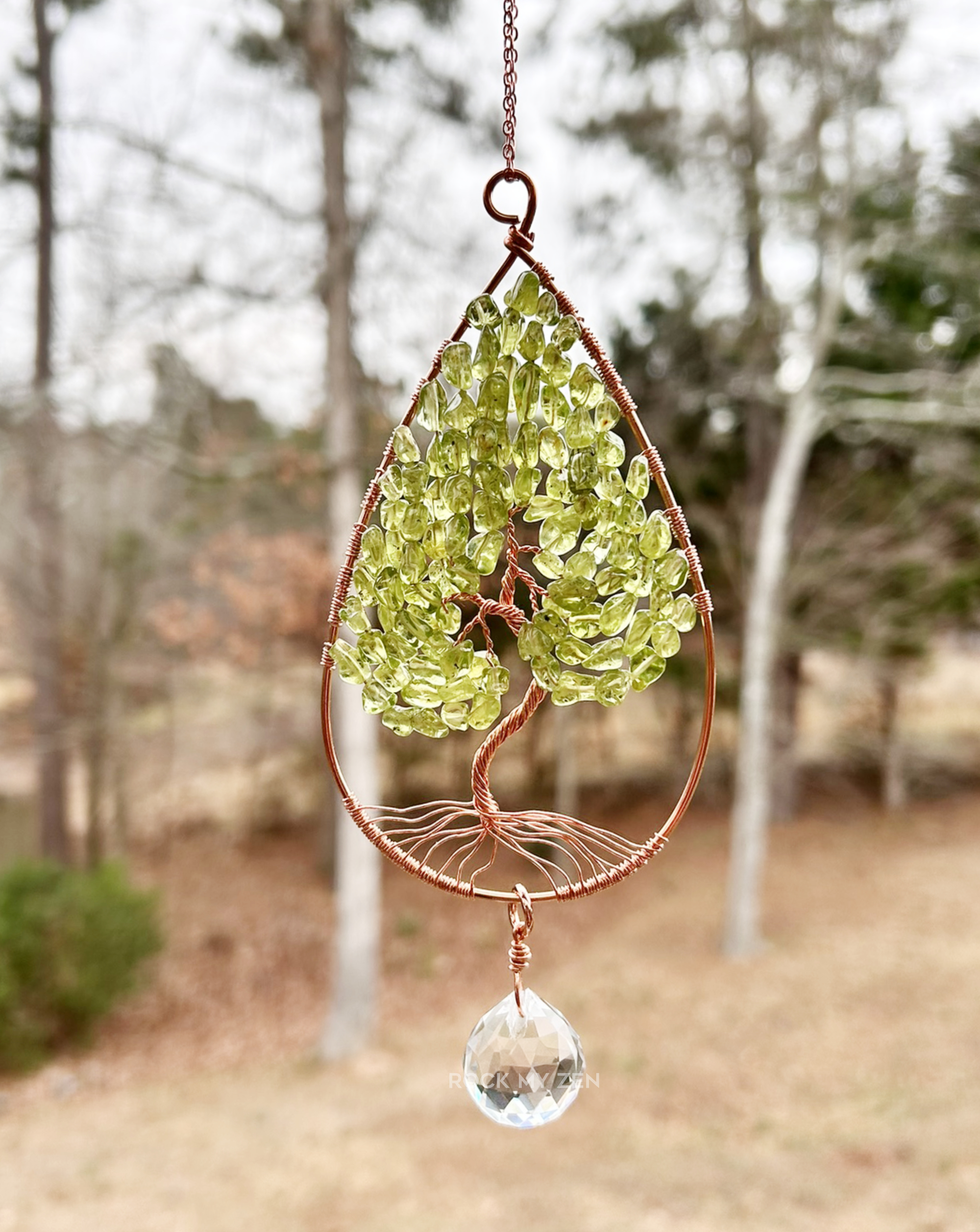 The frame of this gemstone tree sun catcher is approximately 4 inches tall with the prism adding to the length. The frame of the tree was hand formed from bare copper wire into a tear drop shape. The tree is also hand formed from thinner copper wire and strung with gorgeous Peridot beads for the leaves. The tree you receive will look similar to the one in the photos. Bead size and shape can vary depending on who I am able to get them from but photos will be updated with current inventory.